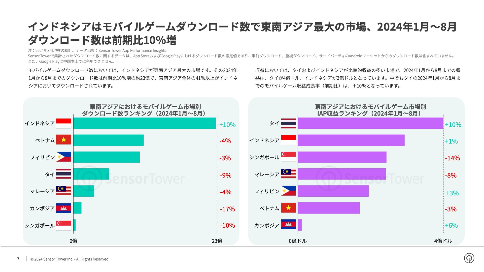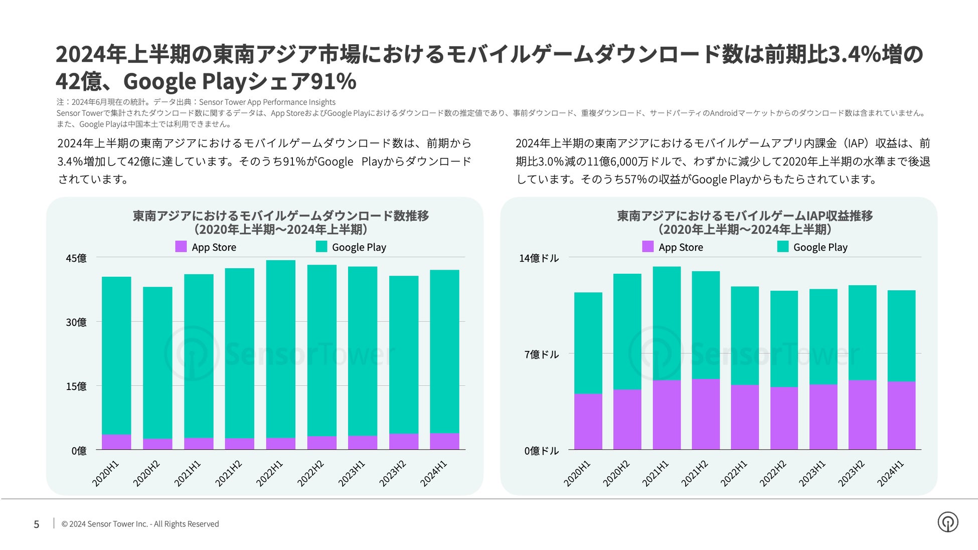 - 2024年上半期の東南アジアモバイルゲームダウンロード数は42億回、インドネシアが市場の41%を占める。