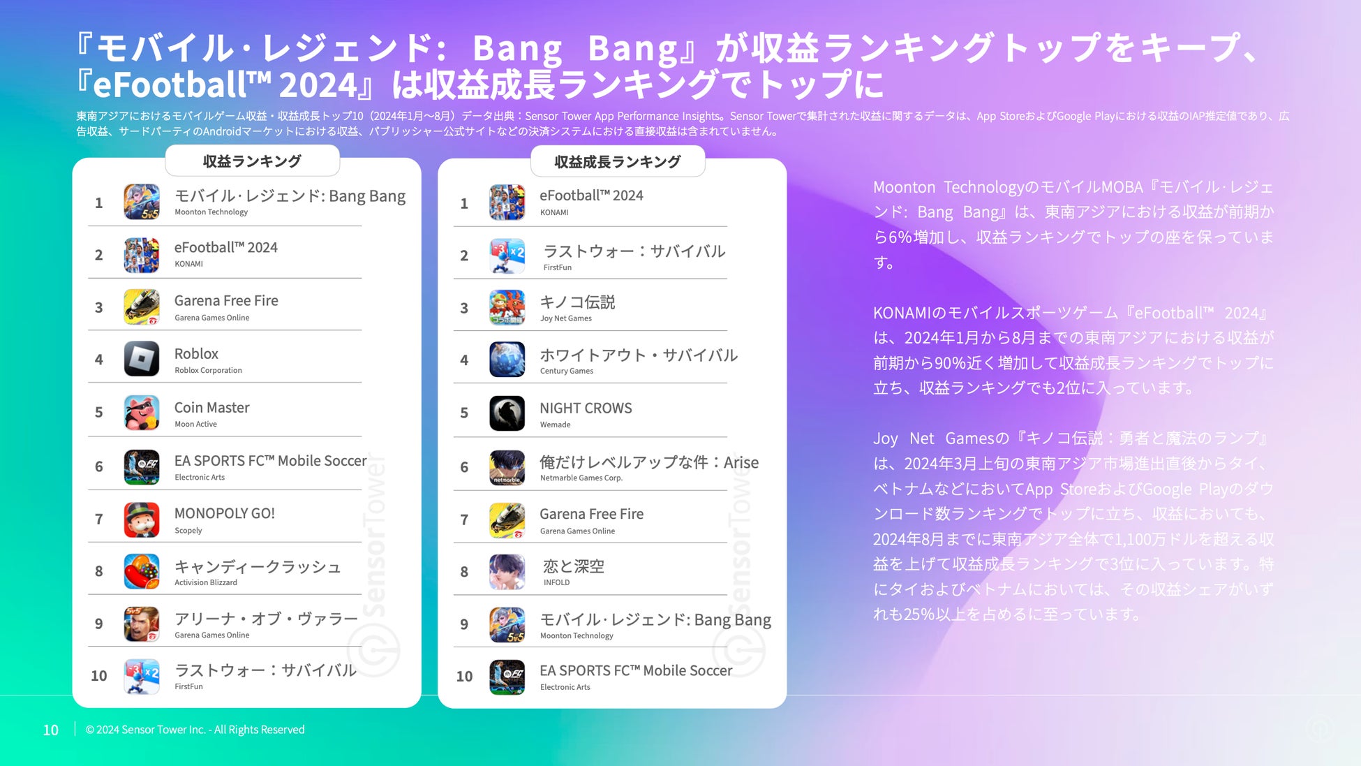 - 収益ランキングでは『モバイルレジェンド: Bang Bang』が1位、『eFootball™ 2024』が2位に位置している。