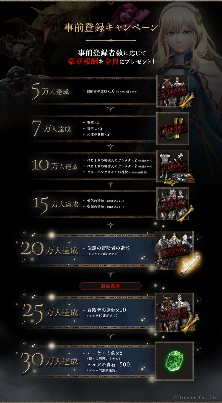 事前登録者数は25万人を突破し、正式リリース後に「冒険者の遺骸×10(キャラ10連ガチャ)」が全員にプレゼントされます。