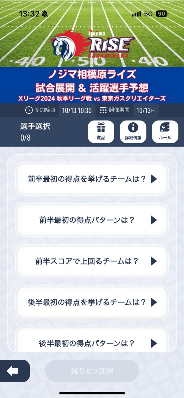 予想内容は、前半・後半の得点チーム、得点パターン、スコアで上回るチーム、勝利チーム、そしてノジマ相模原ライズの「なんドラMVP選手」の8項目です。