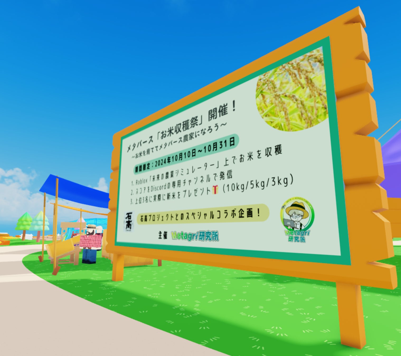 Metagri研究所は、メタバースプラットフォーム「Roblox」で展開する農業ゲーム「未来の農業シミュレーター」において、2024年10月10日から10月31日までの期間、「お米収穫祭 in メタバース」を開催する。