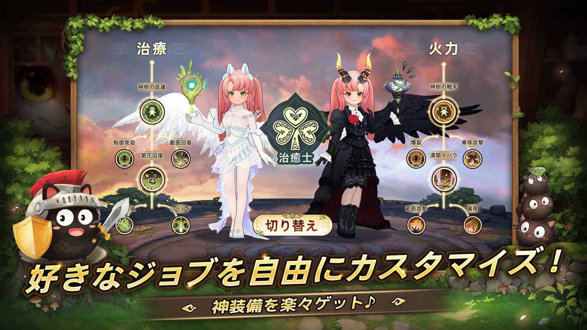 強力な猫霊や変身果実を集め、最強の冒険者を目指しましょう!戦闘職業と生活職業を自由に組み合わせ、自分だけのスタイルで冒険を楽しめます。