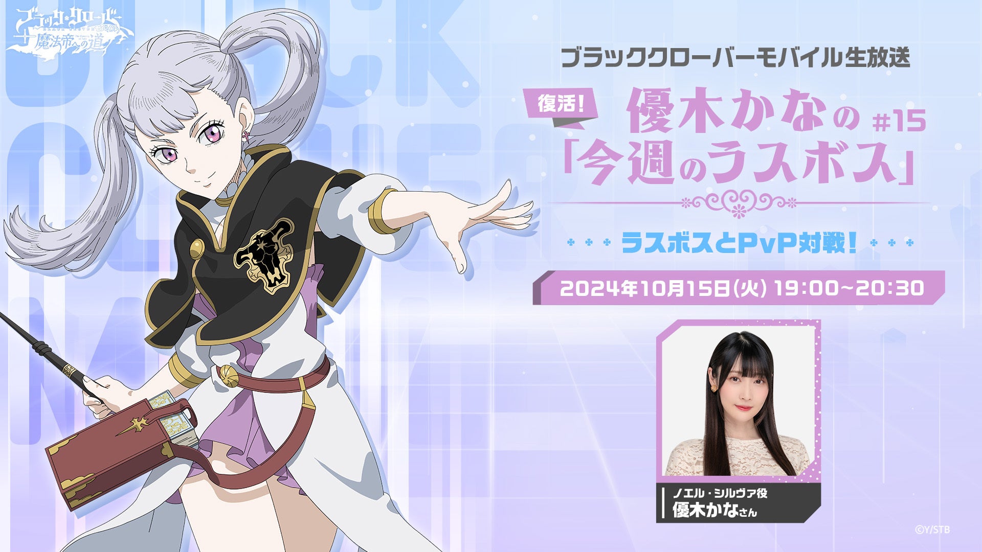 さらに、10月15日19時からは、ノエル・シルヴァ役の声優である優木かなさんが出演する配信番組「今週のラスボス」が公式YouTubeチャンネルにて生配信される。