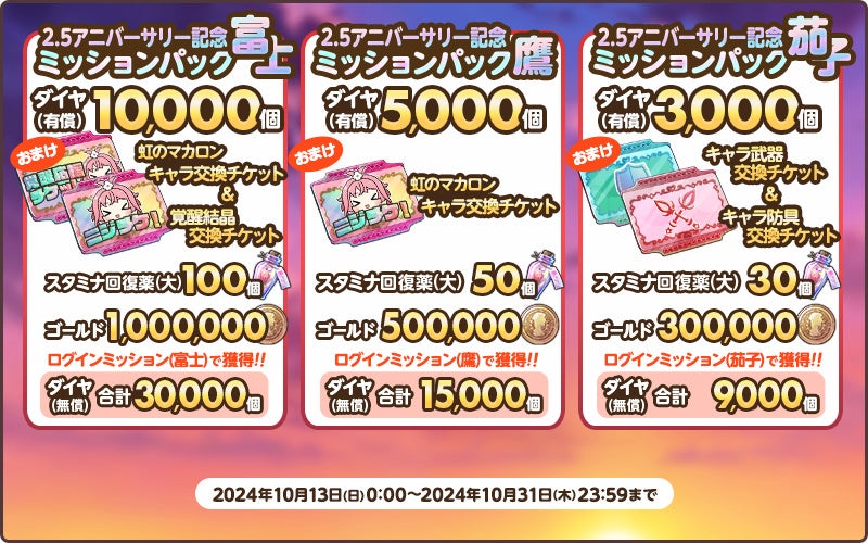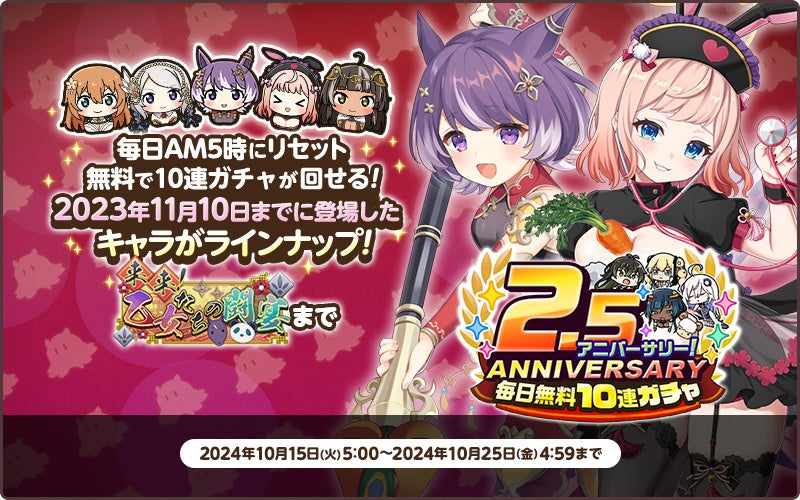 期間中ログインでキャラ交換チケットが貰えたり、Sレア排出率2倍ガチャや毎日無料10連ガチャが開催されている。