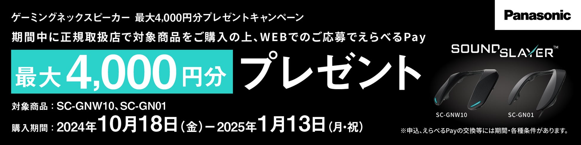 パナソニック株式会社は、2024年10月18日から2025年1月13日までの期間、対象のゲーミングネックスピーカーを購入し、WEBから応募した方を対象に、最大4,000円分の電子ギフトをプレゼントするキャンペーンを実施しています。