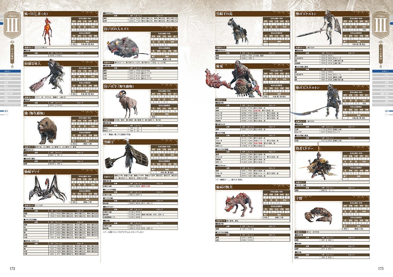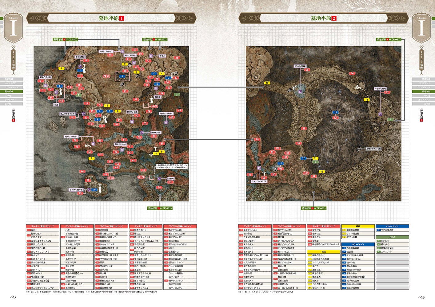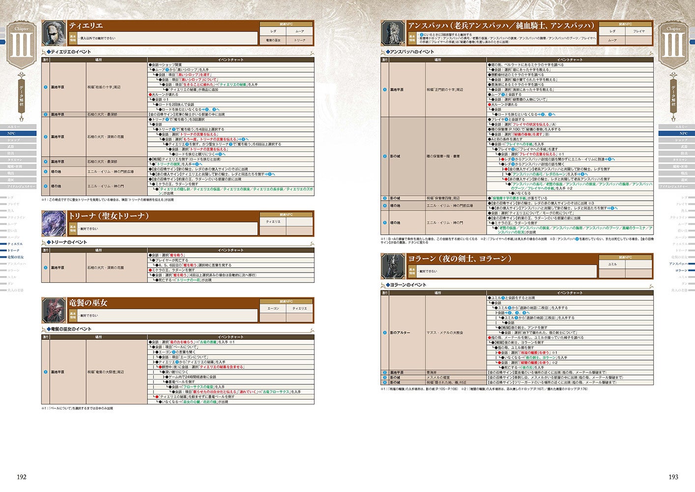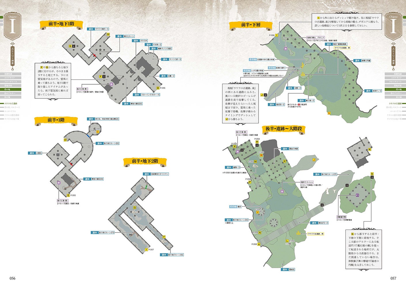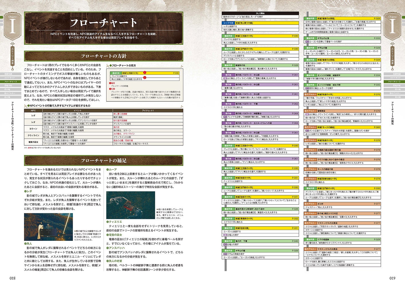 - エリアのつながりを把握できる簡略図やフローチャート、詳細なマップ、ボスとの戦い方、NPCイベント、装備品、アイテムなどの各種データが掲載。