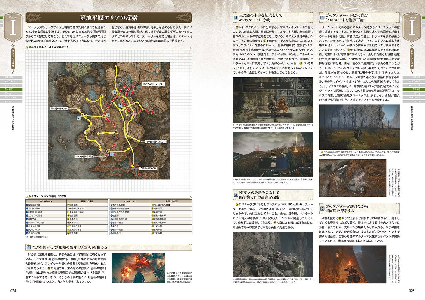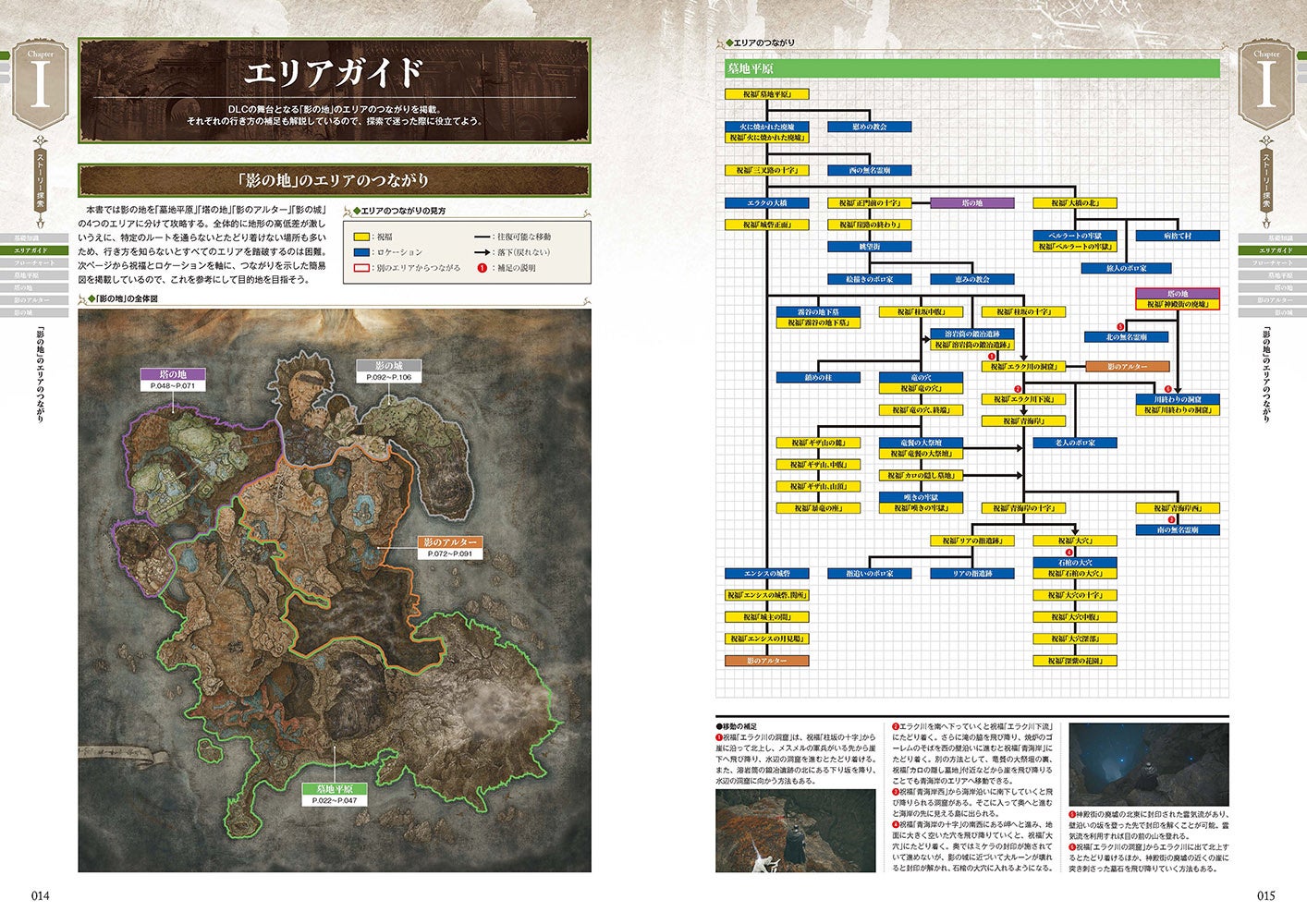 本書は、DLCの舞台である“影の地”をくまなく探索&攻略するための情報を網羅しており、エリアのつながりを把握できる簡略図やフローチャート、詳細なマップ、ボスとの戦い方、NPCイベント、装備品、アイテムなどの各種データが掲載されています。
