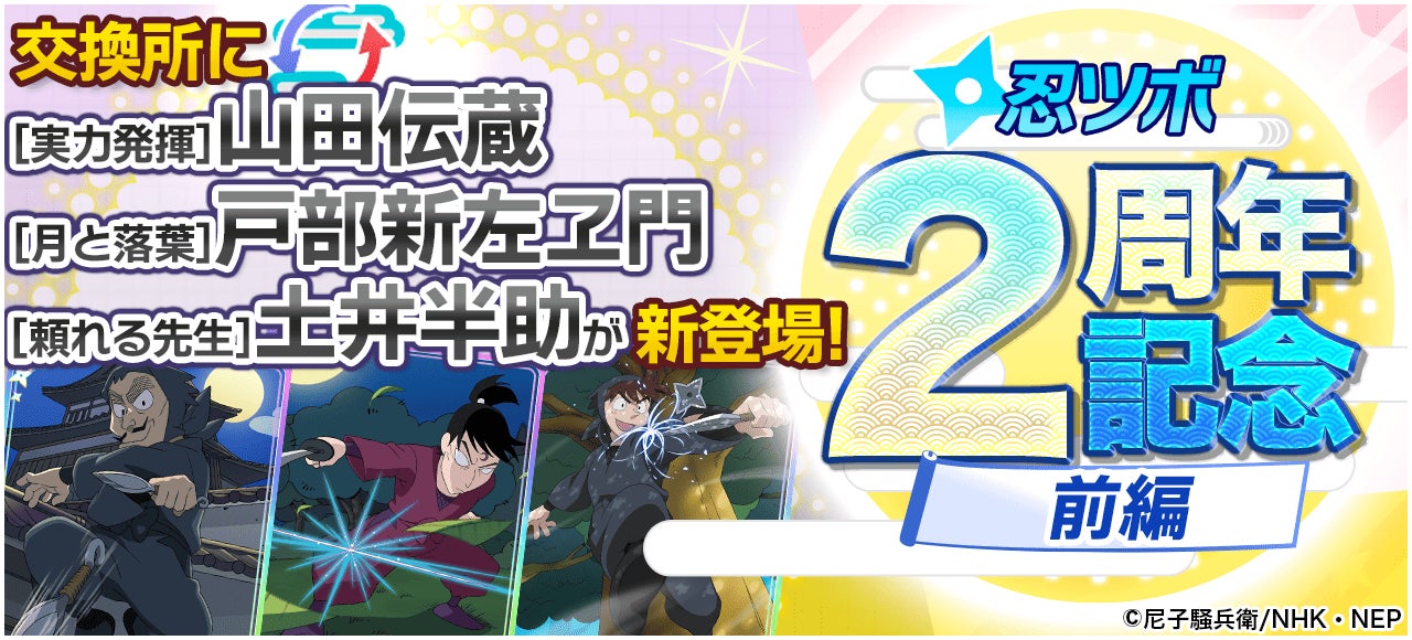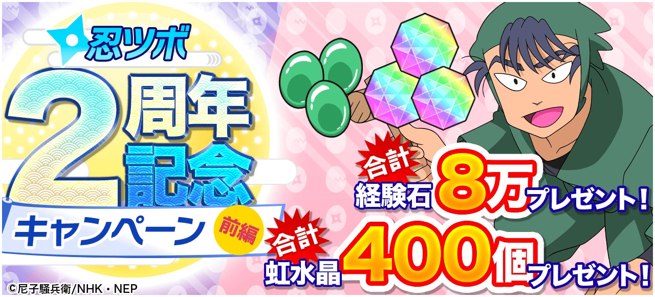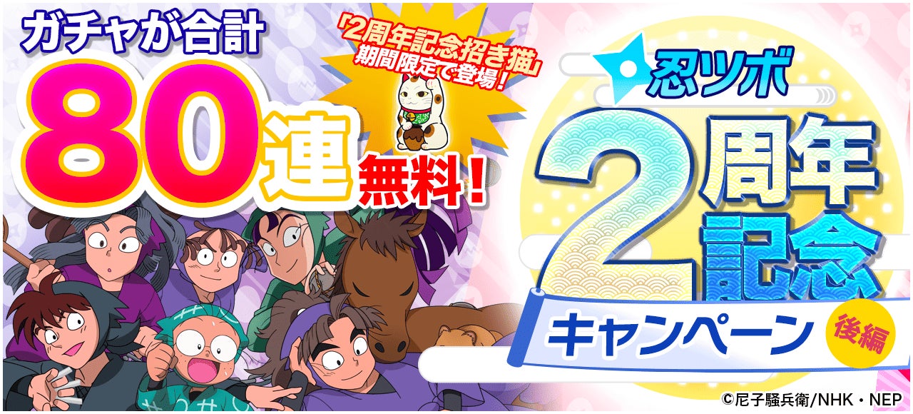 「忍たま乱太郎 ムゲンのツボ大暴走の段」は、2周年を記念して、2024年10月16日から11月1日まで、ログインボーナス、キャラクター交換、ガチャ、虹水晶2倍パックなどのキャンペーンを開催する。