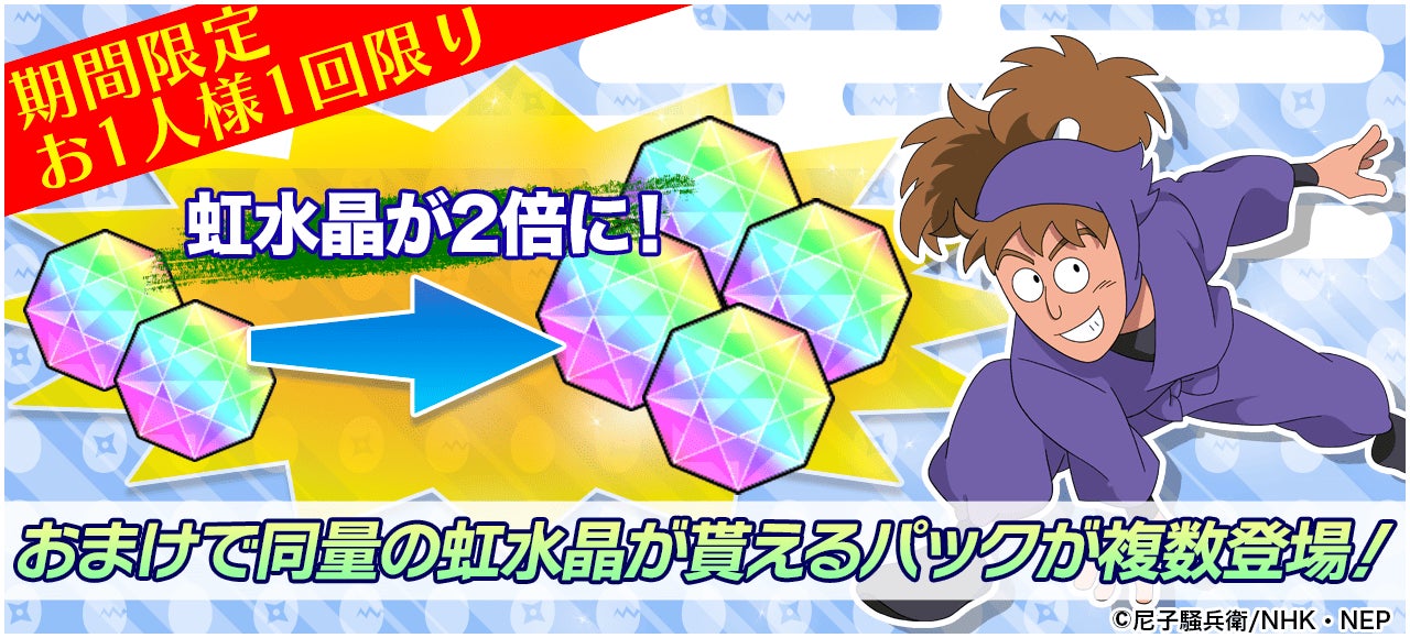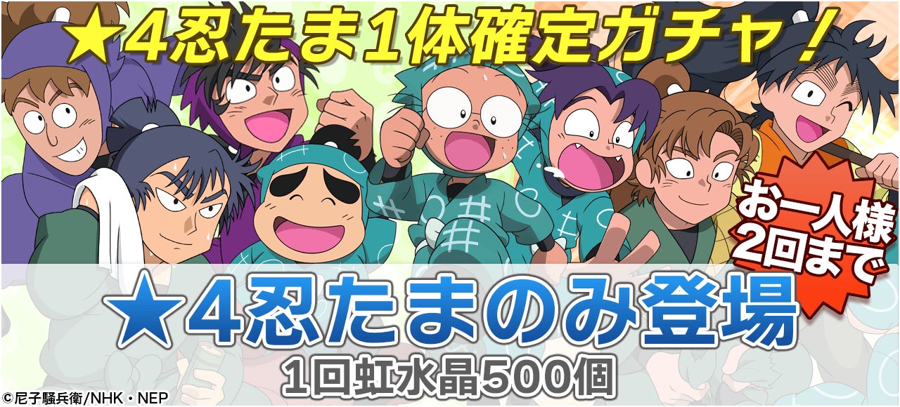期間中は、毎日ログインするだけで虹水晶や経験石を獲得できるほか、★4忍たま確定ガチャや、虹の札を集めて限定キャラクターと交換できるイベントも開催される。