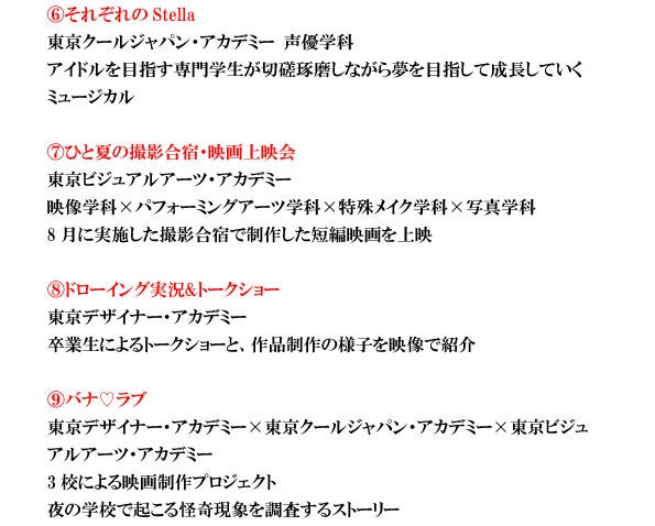 東京地区に展開する、デザイン・ビジュアルアーツ・ホスピタリティ・ビジネス・クールジャパンの専門校6校、全45分野の学生4000名が結集し、e-sportsプロジェクト、ホスピタリティ×ファッション、フラワービジネス×演劇、特殊メイク×コンサート・舞台スタッフなど、様々な分野の学生による企画・運営が行われる。