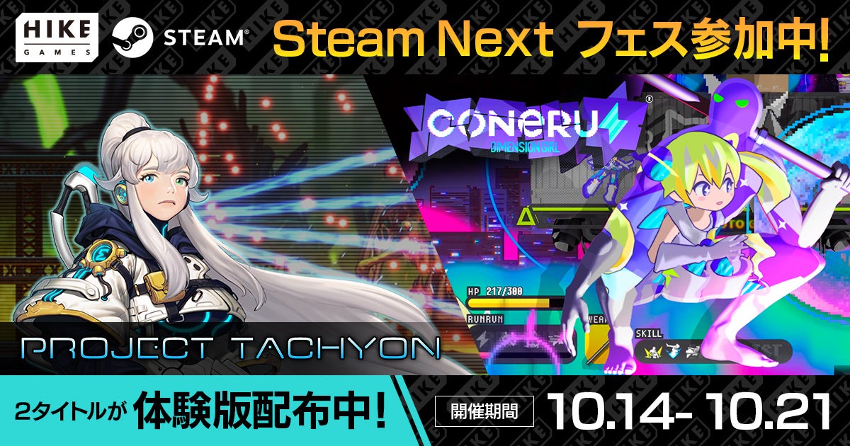 株式会社HIKEのゲームブランド「HIKE GAMES」は、Steam®が実施するSteam Nextフェスに参加し、2025年発売予定のラン&ガンアクションシューティング『PROJECT TACHYON』と2Dアクション“デート”『CONERU -DIMENSION GIRL-』の体験版を公開します。