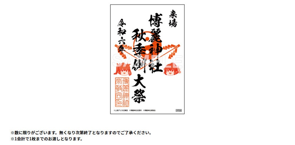 イベントカタログに記載のおためし謎を解いて東方やおよろず商店ブースに持参するとポストカードプレゼント、ブースで1,100円以上購入すると御朱印風ポストカードプレゼントなどの特典も用意。