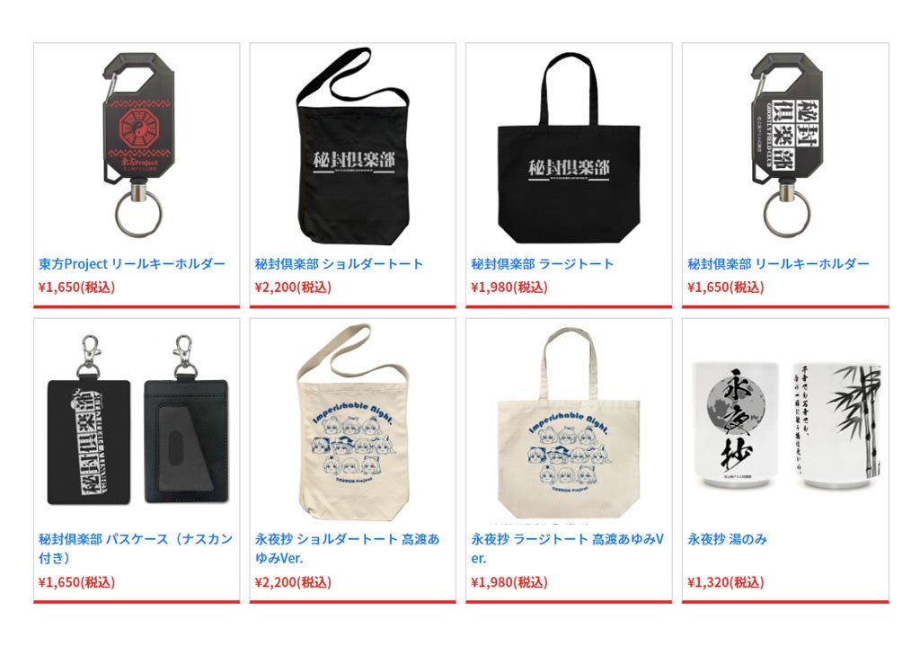 - 東方謎解異変2~2人の記者とふたつのカメラ~、東方謎解異変~巫女と魔女とリドルカード~、ゆっくり幻想郷 フルカラーハンドタオル、東方Project リールキーホルダー、秘封倶楽部 ショルダートート、秘封倶楽部 ラージトート、秘封倶楽部 リールキーホルダー、秘封倶楽部 パスケース、永夜抄 ショルダートート、永夜抄 ラージトート、永夜抄 湯のみ