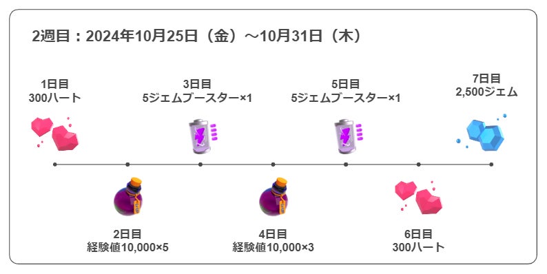 期間中はログインするだけで、ジェムやハートなどのアイテムを獲得できます。