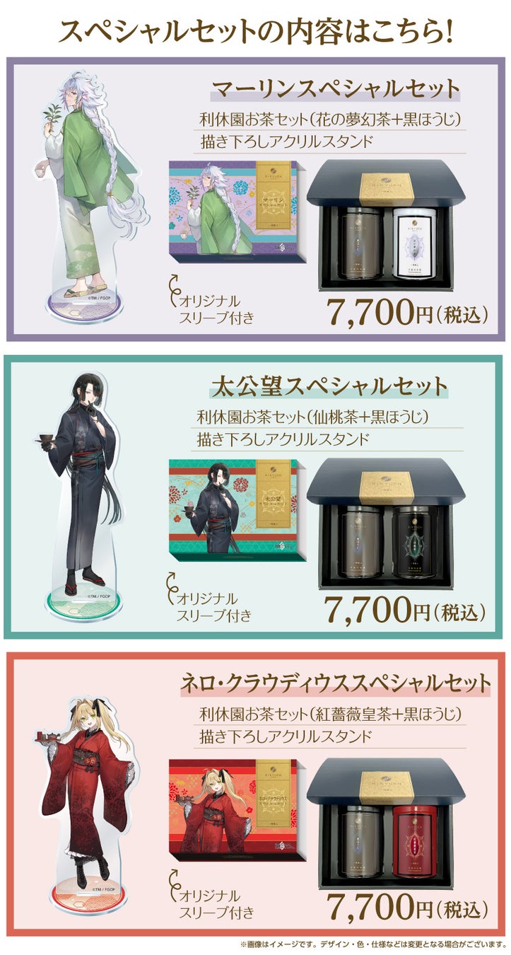 各サーヴァントのオリジナルブレンド茶と京都利休園を代表するお茶「黒ほうじ」、オリジナルグッズをセットにした「スペシャルセット2」がSTORESにて販売されます。