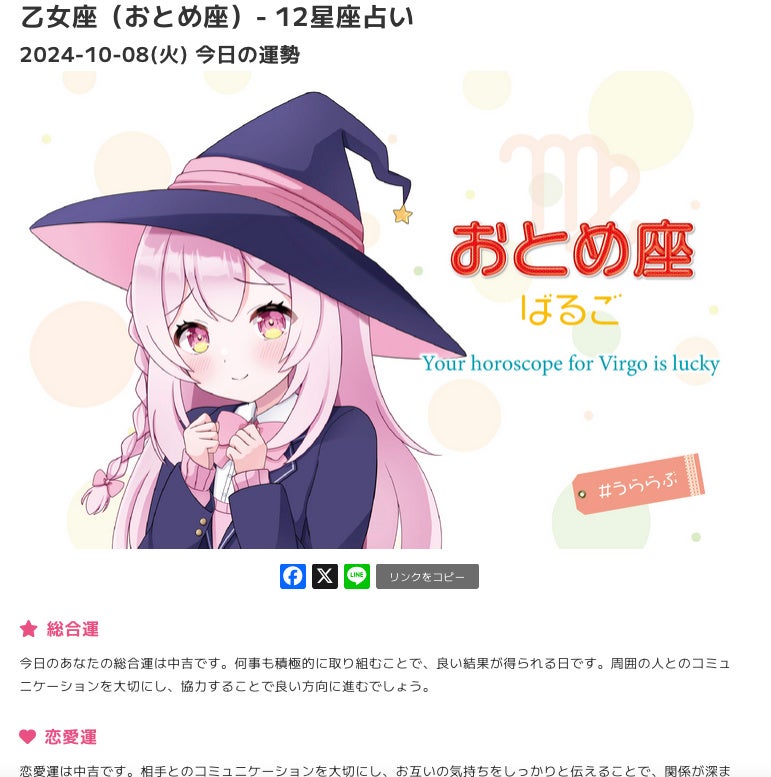 株式会社乙栄商会は、AI技術を活用した無料の占いサイト『うららぶ®︎』のβ版を2024年10月18日にリリースしました。