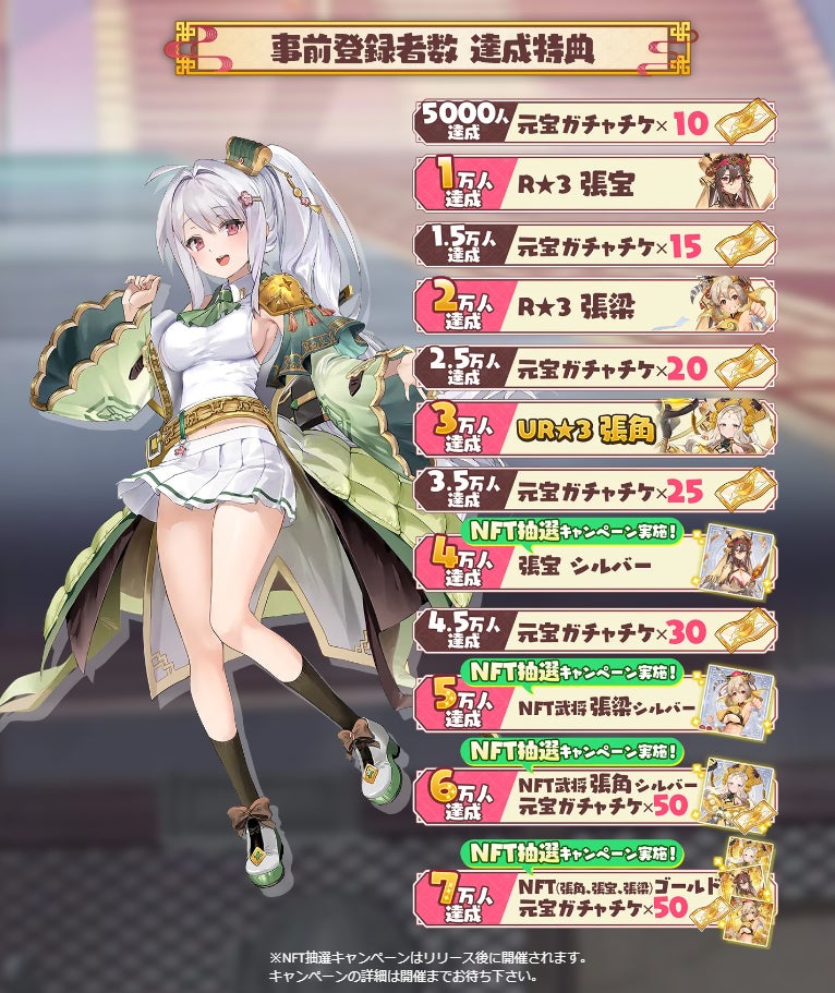 事前登録者数に応じて、ゲーム内アイテムやNFT武将がプレゼントされる。