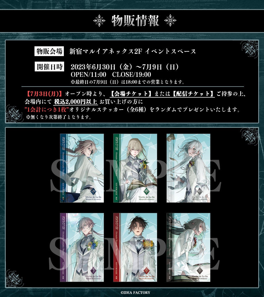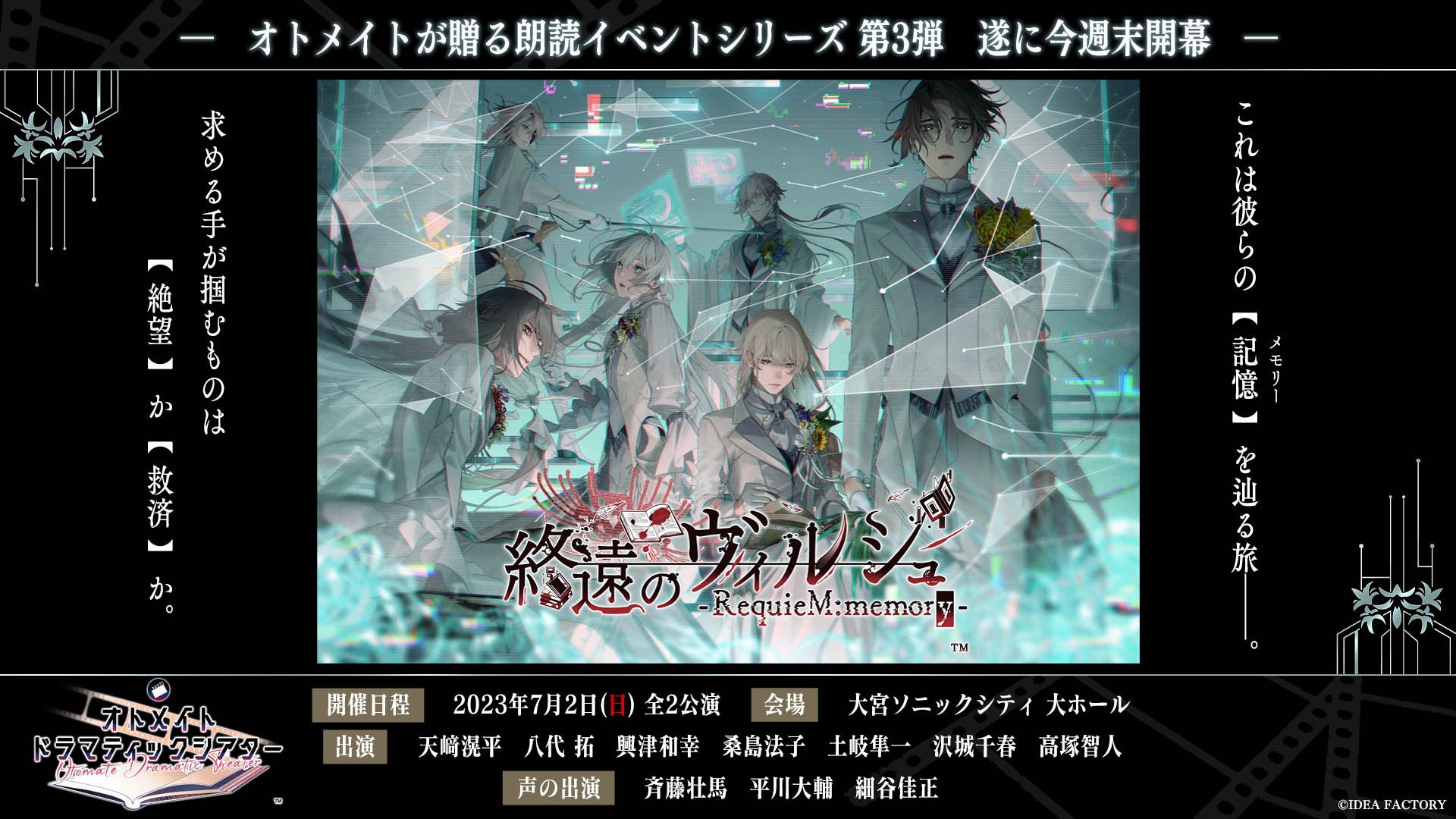 アイディアファクトリー株式会社の女性向けゲームブランド「オトメイト」から、オトメイトドラマティックシアター vol.03「終遠のヴィルシュ -RequieM:memory-」のアーカイブ配信チケット情報と物販でのオリジナルステッカープレゼント企画をお知らせいたします。