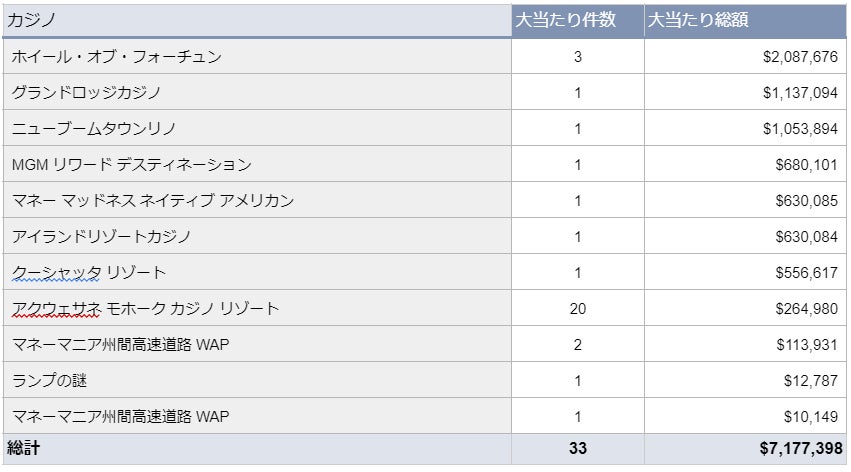 最高額は「ホイール・オブ・フォーチュン」の2,087,676ドルで、大当たり件数が多いのは「アクウェサネ モホーク カジノ リゾート」の20件。