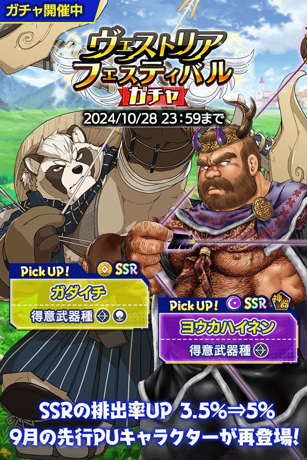 さらに、SSRの入手確率が大幅にUPした「ヴェストリアフェスガチャ」や、未所持SSRが1体確定する「極致絆成武闘宴応援未所持SSR確定ステップアップガチャ」も同時開催されています。