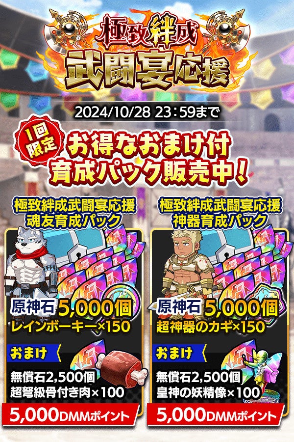 イベント期間中は、原神石がおトクに購入できる「第4回極致絆成武闘宴スペシャルパック」や、レインボーキーや超神器のカギがセットになった「極致絆成武闘宴応援育成パック」も販売されます。