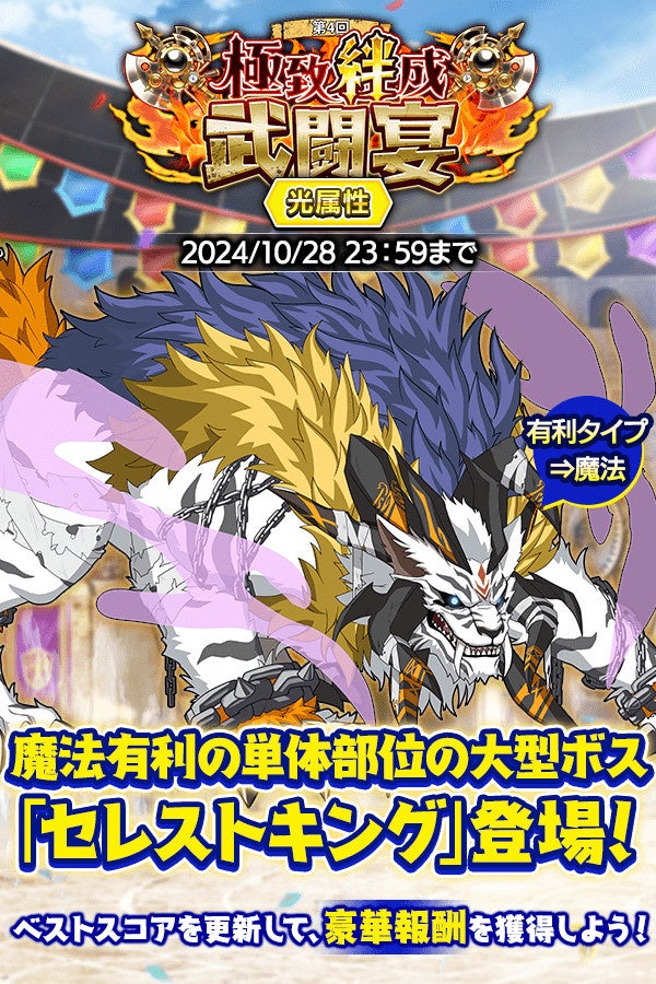 RPG『クレイヴ・サーガ 神絆の導師』にて、光属性ボス「セレストキング」に挑戦する新イベント「極致絆成武闘宴」が開催されました。