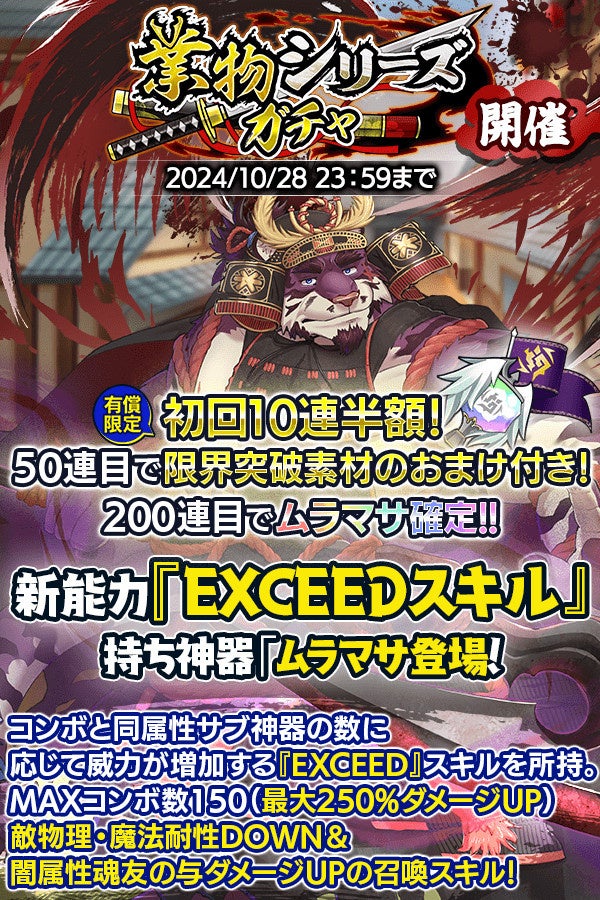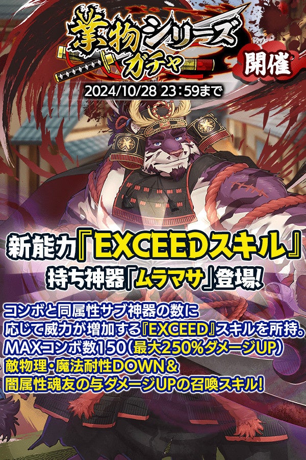 また、イベントを記念した武器ガチャ「極致絆成武闘宴百幻獣王武器ガチャ」や「EXCEED」スキルを持つ新神器「ムラマサ」が登場する「業物シリーズガチャ」も開催されています。