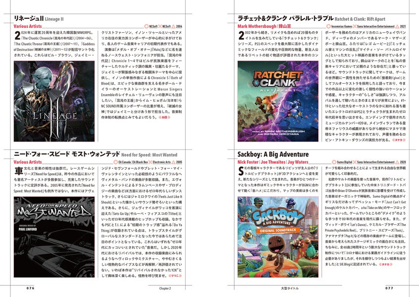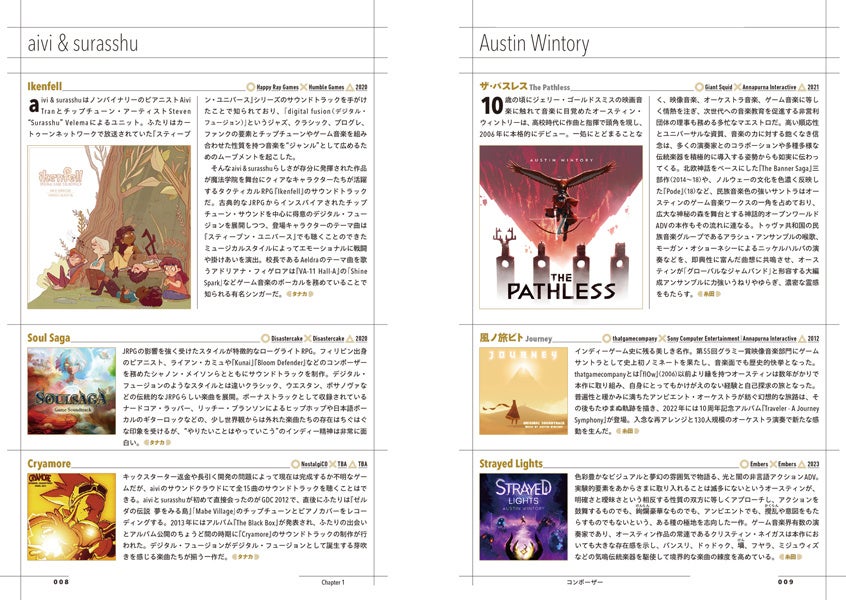 コンポーザー、大型タイトル、インディーゲーム、オムニバス、バンド/ユニット、音楽ゲーム/リズムゲームの全6章構成で、注目コンポーザーへのインタビューや、デヴィッド・ワイズ、VALORANTなど、深掘りコラムも充実している。