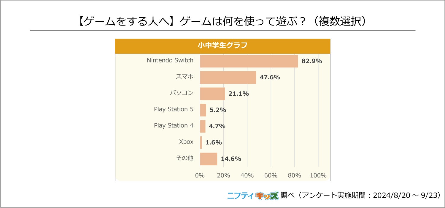 ゲームプレイ時間は小学生では「30分~1時間」、中学生では「1~2時間」が最も多く、使用機器は「Nintendo Switch」が82.9%と圧倒的な人気を誇っています。
