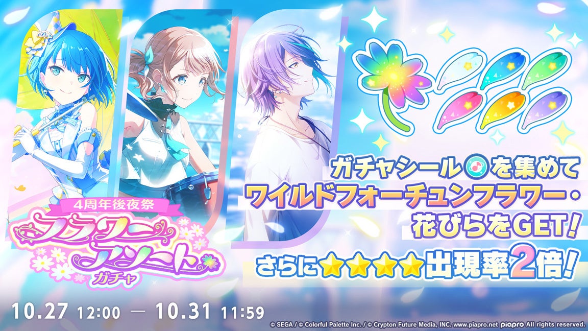 また、新曲3曲の追加や、「第24回楽曲コンテストプロセカNEXT」の採用作品発表、難易度「APPEND」譜面追加楽曲決定、4周年後夜祭ガチャ「フラワーアソートガチャ」開催、ハロウィンログインキャンペーン、ハロウィン2024ライブ開催、10thシングル発売情報などの新情報も公開された。
