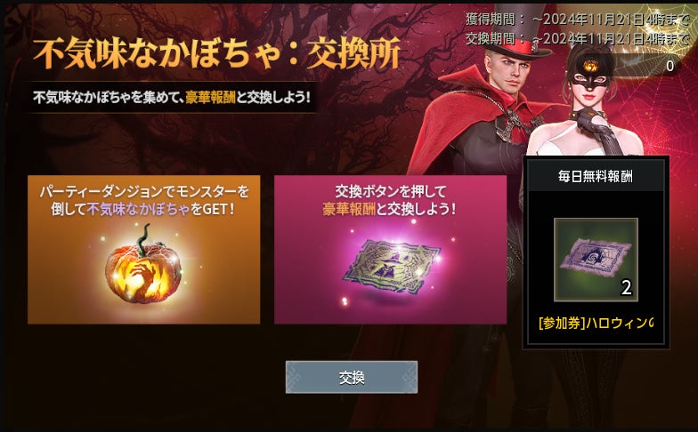 プレイするとハロウィン外見アバターがもらえ、イベントダンジョンをクリアするとハロウィン外見アバターや強化アイテムと交換できる「不気味なかぼちゃ」が手に入ります。