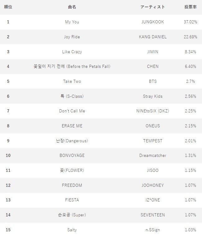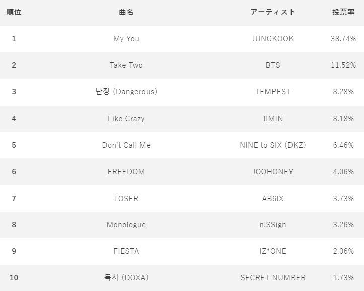 また、6月30日の放送回ではJUNGKOOKの「My You」が5週連続1位を獲得しました。