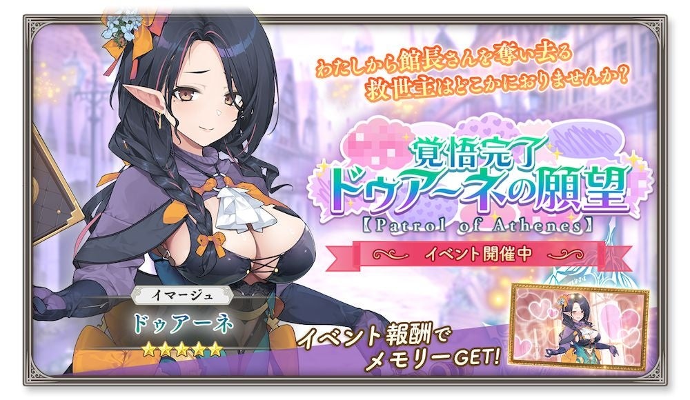 また、新イベント『覚悟完了ドゥアーネの願望【Patrol of Athenes】』では、イベント限定の挑戦ステージをクリアすることで、メモリー「重く甘美な歪んだ純愛」など様々な報酬を獲得できます。