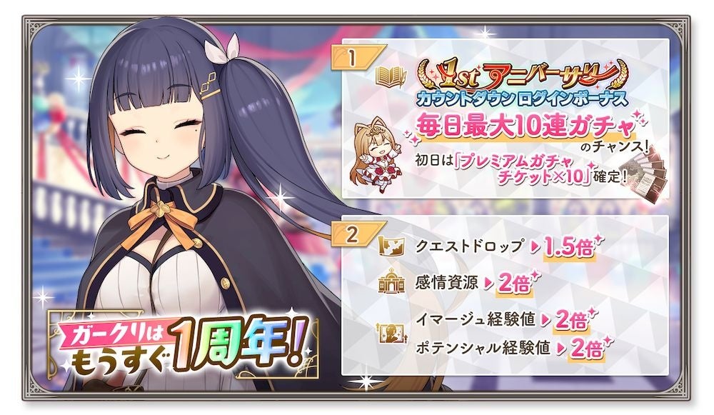 - 1周年記念カウントダウンキャンペーンでは、毎日最大10連分のガチャチケットが当たるログインボーナスや、ドロップアイテム獲得倍率アップキャンペーンを実施。