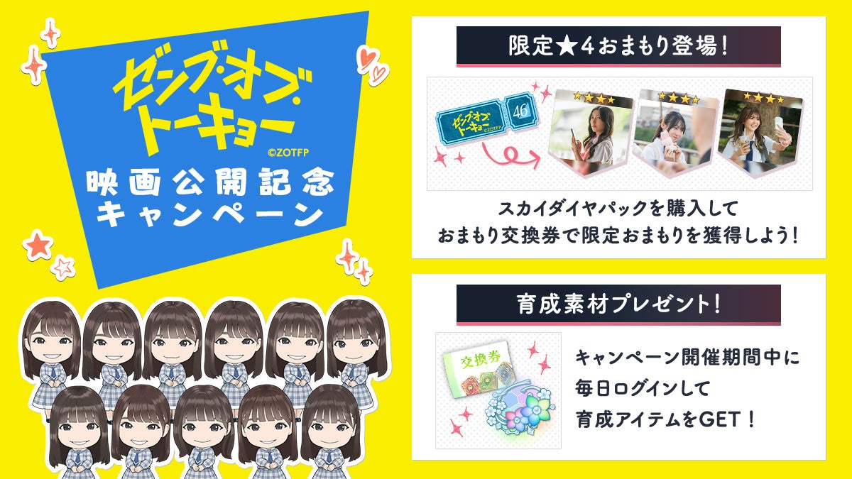 さらに、映画「ゼンブ・オブ・トーキョー」公開記念キャンペーンも開催されており、育成アイテムが獲得できるログインボーナスや限定★4おまもり交換券付のスカイダイヤパックが販売されます。