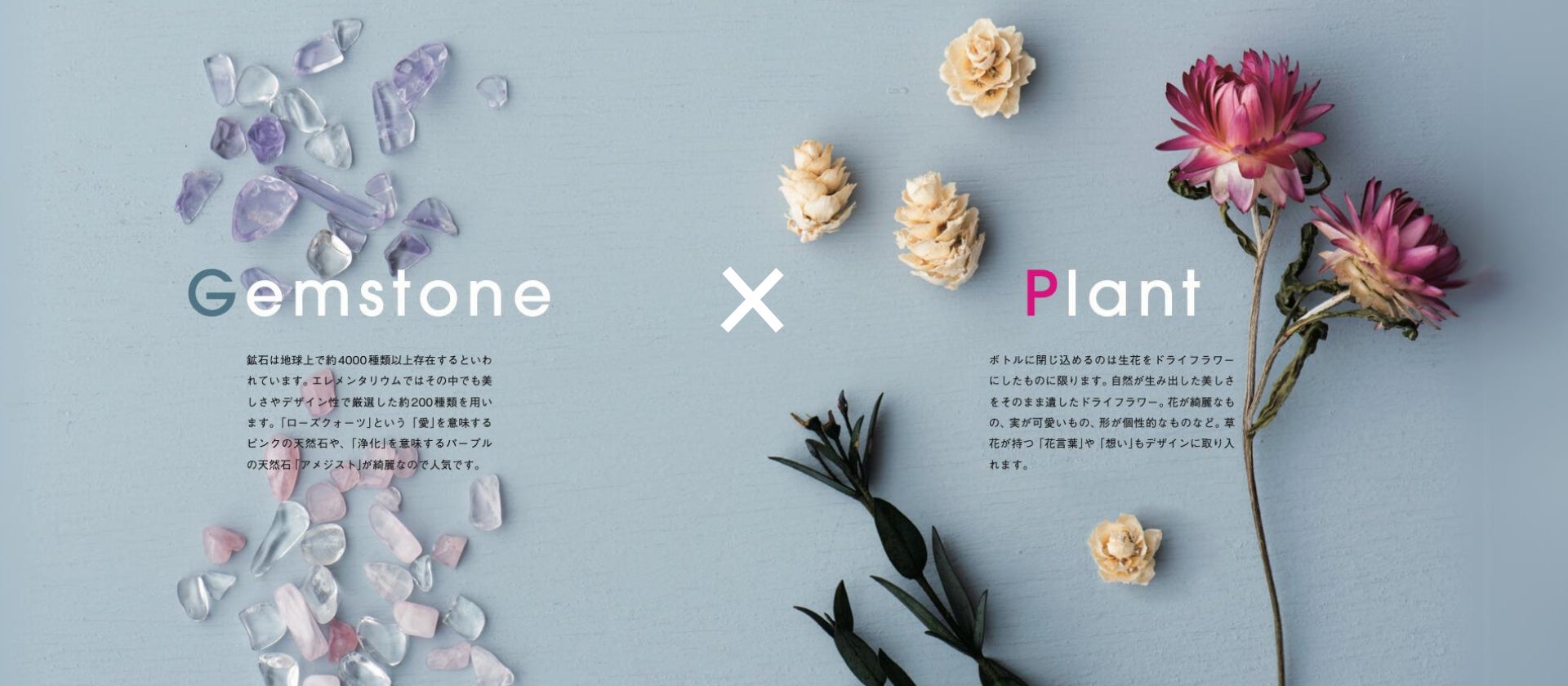 elementariumは、世界最高ランクの天然石と厳選されたドライフラワーを使用し、プロのフラワーアーティストが手作りで制作しています。