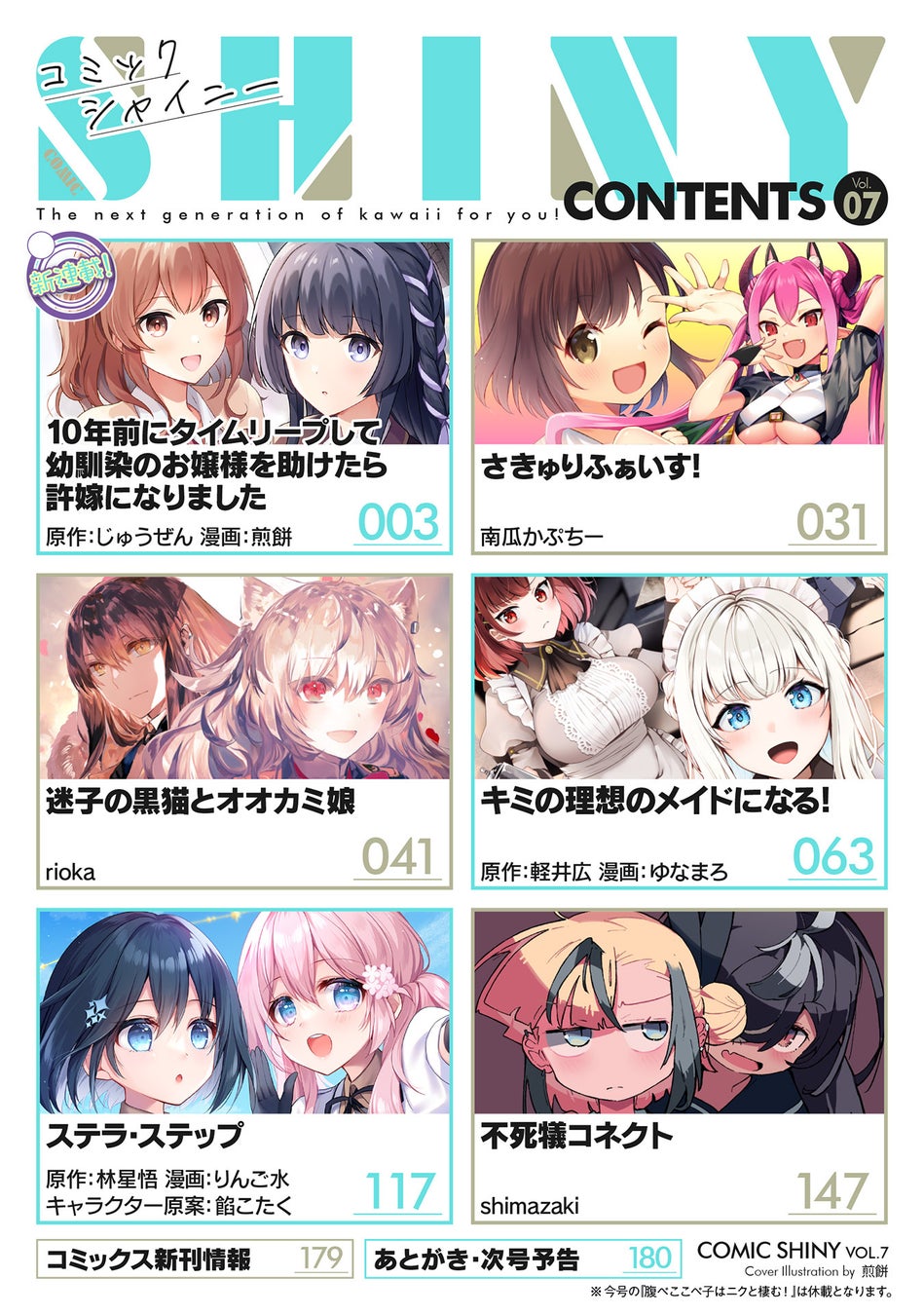 コミックシャイニー、10年前にタイムリープして幼馴染のお嬢様を助けたら許嫁になりました、さきゅりふぁいす!、迷子の黒猫とオオカミ娘、キミの理想のメイドになる!、ステラ・ステップ、不死犠コネクト