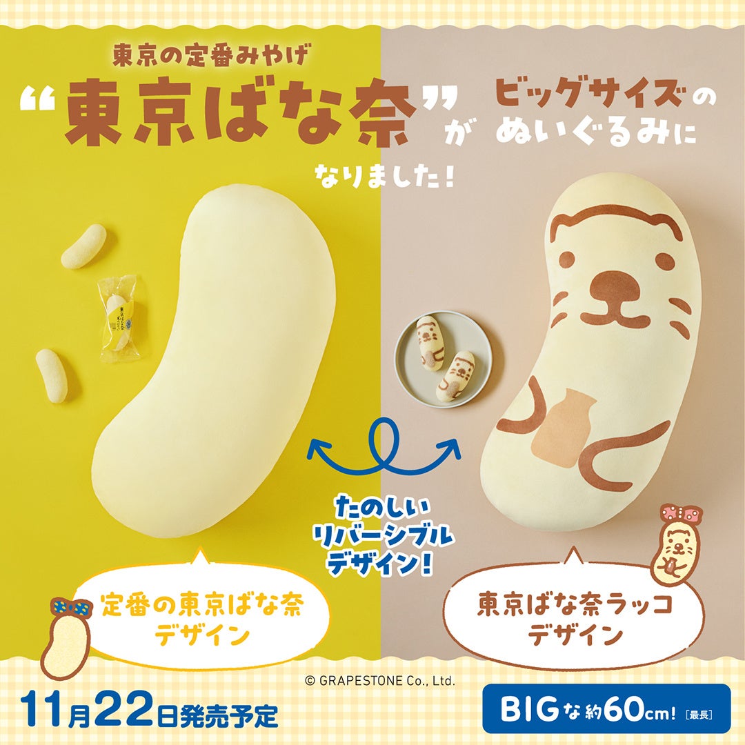 約60cmのBIGサイズのぬいぐるみは、定番の東京ばな奈とコーヒー牛乳味のラッコ柄のリバーシブル仕様です。