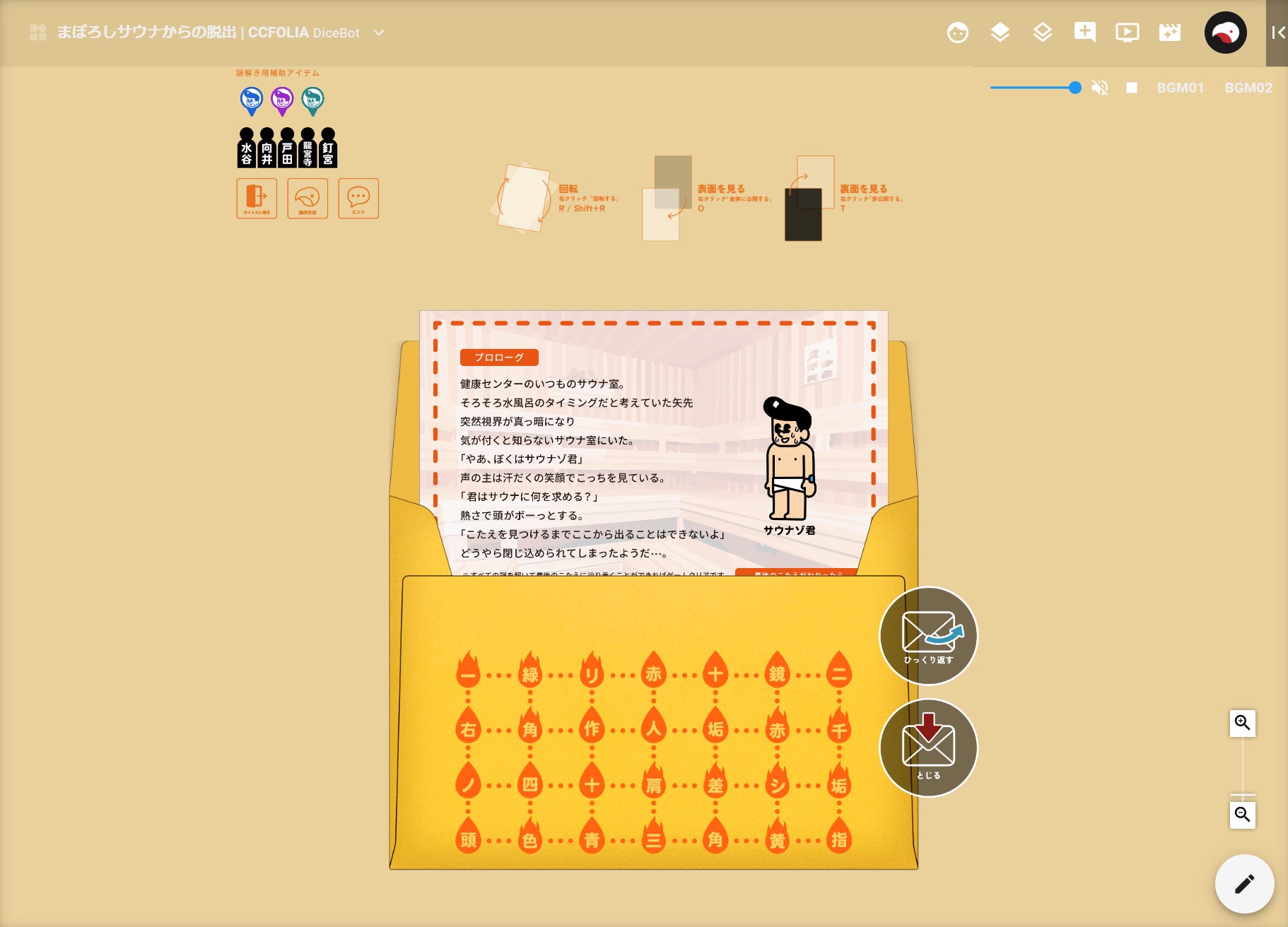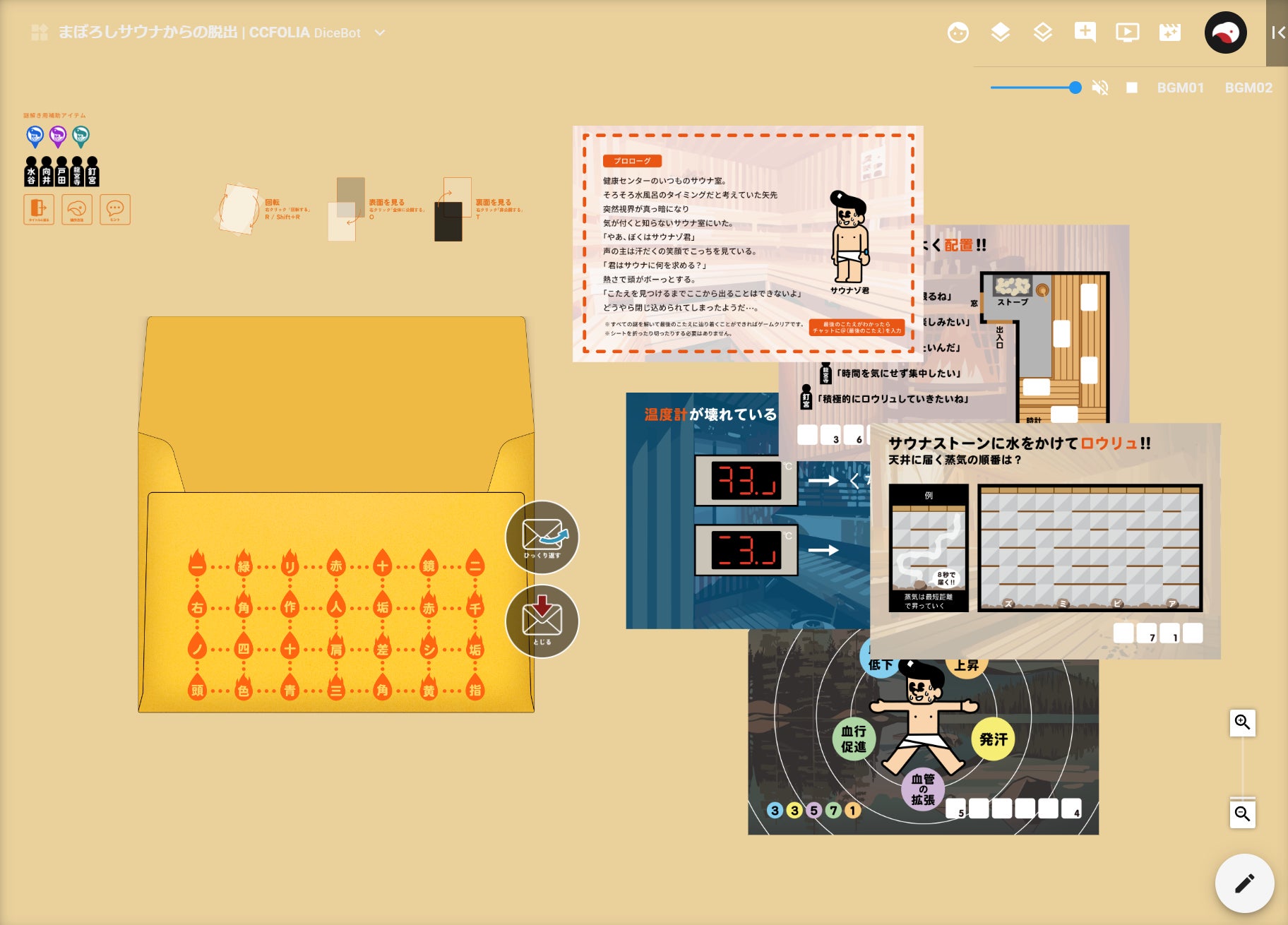 札幌市のボードゲーム・謎解きゲームメーカーClaGlaの謎解きブランド「ナゾグラ」から、スマートフォン対応のTRPG向けクラウドツール「ココフォリア」で遊べる『ヘルシー系謎解き まぼろしサウナからの脱出 ココフォリア版』が10月30日に発売されました。