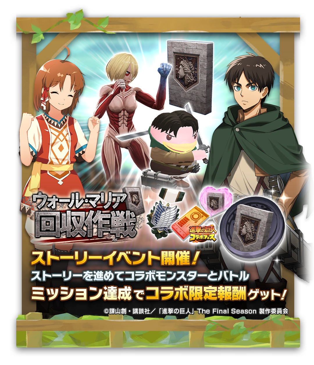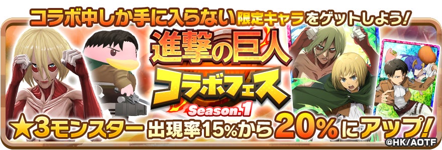- 『進撃の巨人』をモチーフにしたコラボモンスター「調査兵モッチー」と「女型の巨人」が登場するガチャイベント「進撃コラボフェスSeason1」を開催