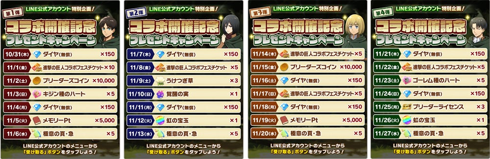 コラボを記念して、『進撃の巨人』をモチーフにしたモンスターやアシストカードが登場するガチャイベントや、ゲーム内イベントが開催されます。