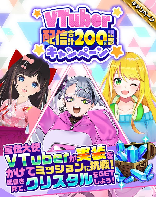 ログインボーナスや視聴回数に応じたクリスタルプレゼントに加え、宣伝大使VTuber3名がゲーム内実装をかけたお題に挑戦します。