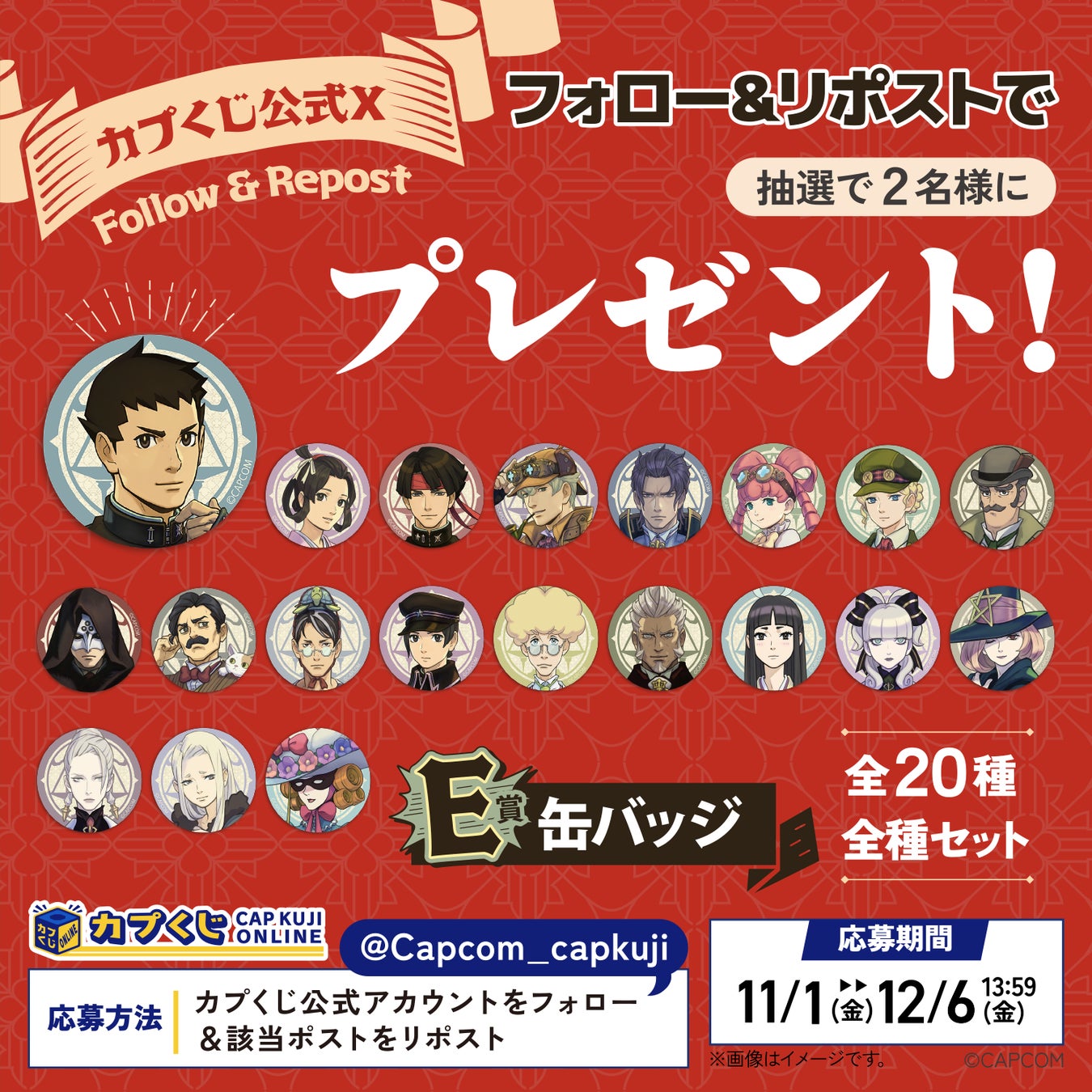 また、カプくじオンラインの公式X(旧Twitter)アカウントをフォローして対象のポストをリポストすると、抽選で2名様に「E賞:缶バッジ全20種セット」がプレゼントされるキャンペーンも開催されています。