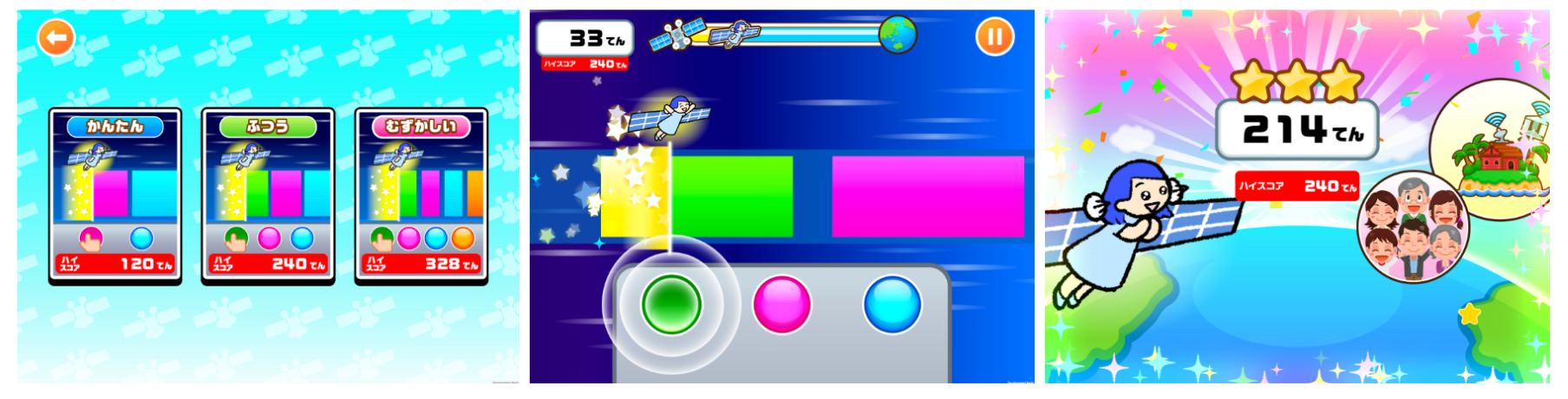 衛星放送をはじめ、災害地域や通信未整備地域、船舶・航空機などの移動体に、通信衛星から電波を届け、通信がなく困っている人を助けてあげるゲームです。人工衛星をモチーフとしたキャラクターが電波を地上に届けるため、左(衛星側)から右(地上側)に向かって移動する際に出現するパネルと同じ色のボタンをタイミング良く長押しすることで得点が加算されていきます。「かんたん」「ふつう」「むずかしい」の全3ステージで構成され、徐々に難易度があがっていきます。
