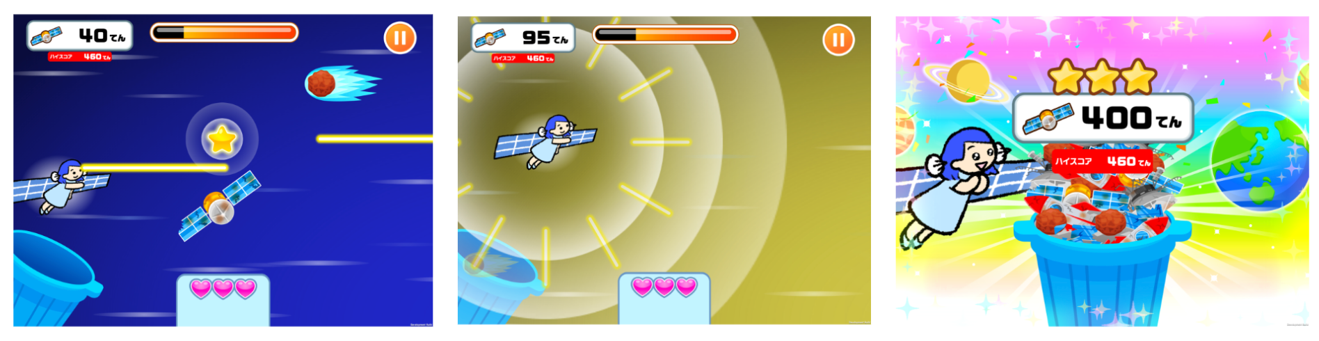 スペースデブリ(宇宙ごみ)の除去作業を体験できるゲームです。人工衛星をモチーフとしたキャラクターから微弱なレーザーが照射され、微弱なレーザーがスペースデブリに命中すると軌道が変わってゴミ箱にはいります。キャラクターを上下左右に自由に操作しながら、たくさんのデブリ除去を目指します。ゲーム中に登場する星を取得すると画面上のすべてのスペースデブリをゴミ箱にいれることができます。
