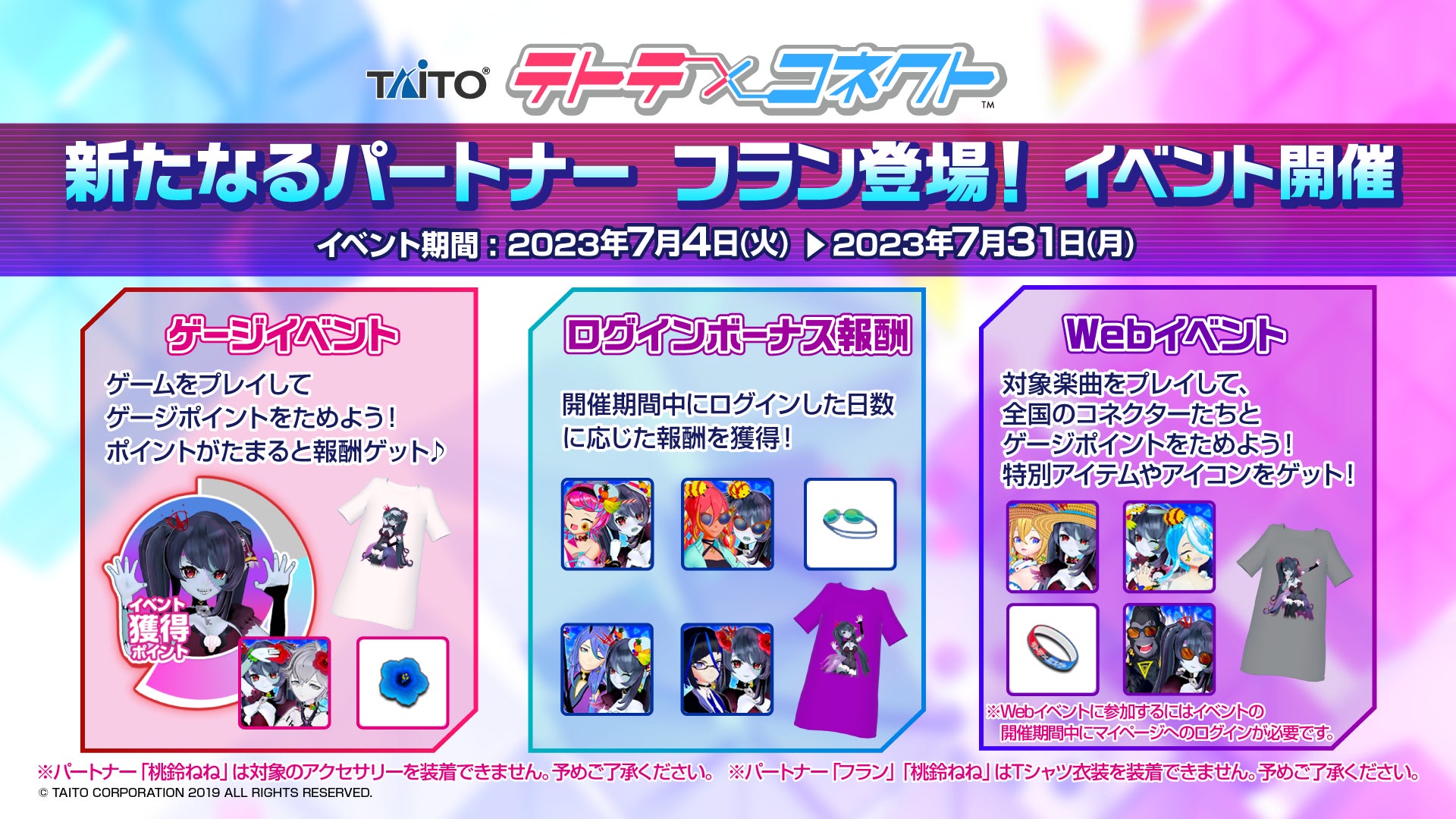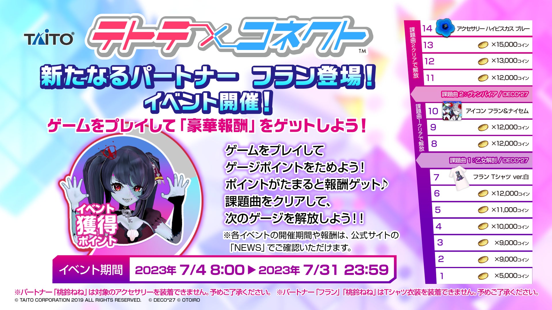 株式会社タイトーは、アーケード用リズムアクションゲーム『テトテコネクト』において、声優の川口莉奈さん演じる新パートナー「フラン」の大型アップデートを実施しました。