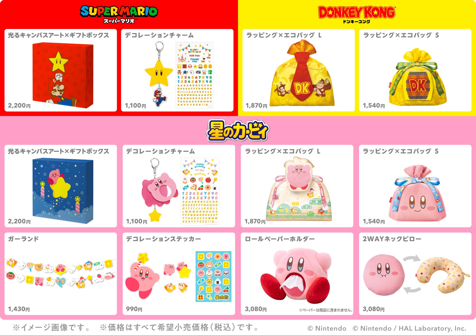 - スーパーマリオ 光るキャンバスアート×ギフトボックス、スーパーマリオ デコレーションチャーム、星のカービィ 光るキャンバスアート×ギフトボックス、星のカービィ デコレーションチャーム、星のカービィ ラッピング×エコバッグ L、星のカービィ ラッピング×エコバッグ S、星のカービィ デコレーションステッカー、星のカービィ ガーランド、星のカービィ ロールペーパーホルダー、星のカービィ 2WAYネックピロー、ドンキーコング ラッピング×エコバッグ L、ドンキーコング ラッピング×エコバッグ S