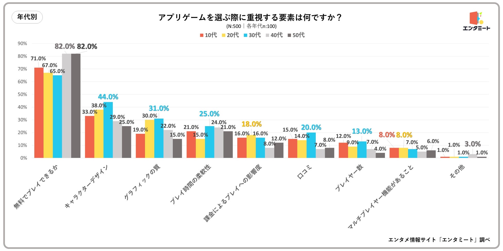 男女別では、女性は無料であることを重視する傾向があり、男性はグラフィックやプレイ時間の柔軟性などゲームに直結する要素を重視する傾向が見られました。