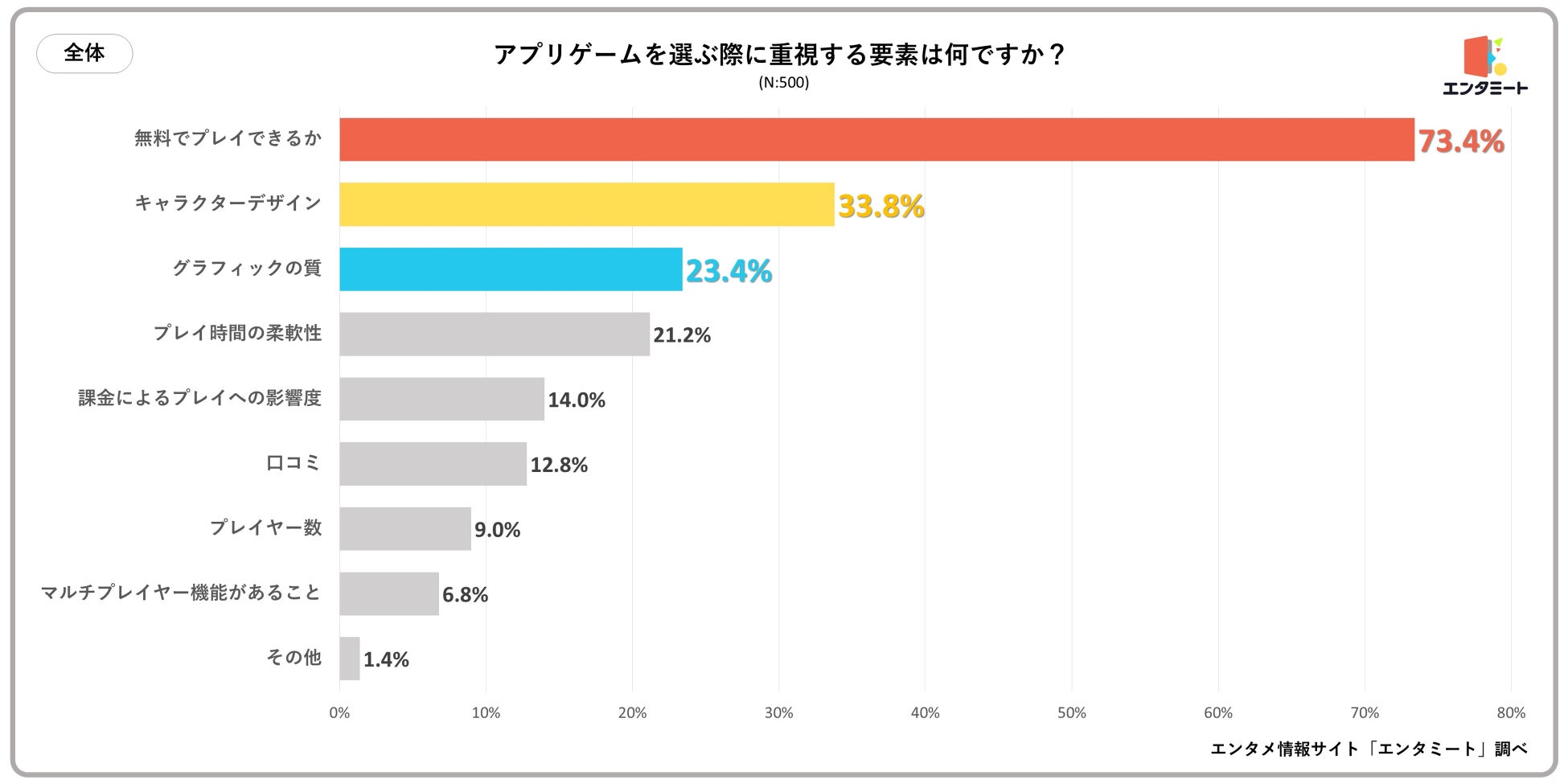 株式会社ドリーム・トレイン・インターネットが運営するエンタミートは、アプリゲームに関するアンケートを実施し、アプリゲームを選ぶ際に重視する要素として、全体では「無料でプレイできるか」が73.4%と最も多く、次いで「キャラクターデザイン」が33.8%、「グラフィックの質」が23.4%という結果になりました。