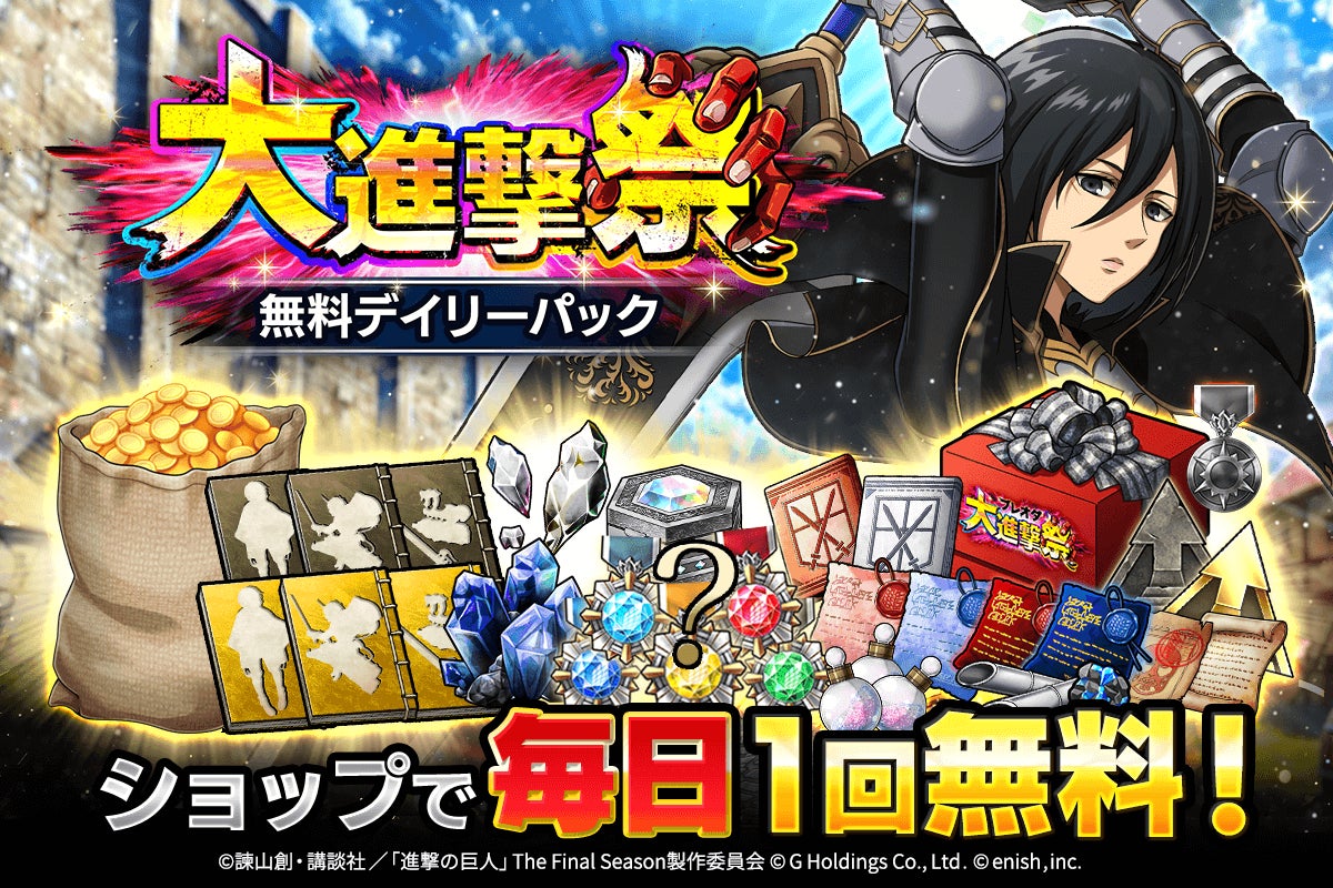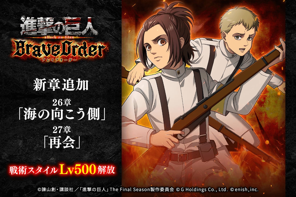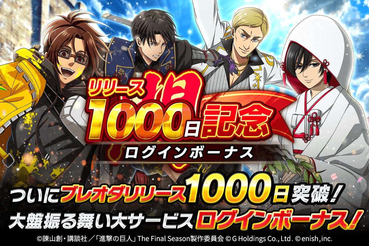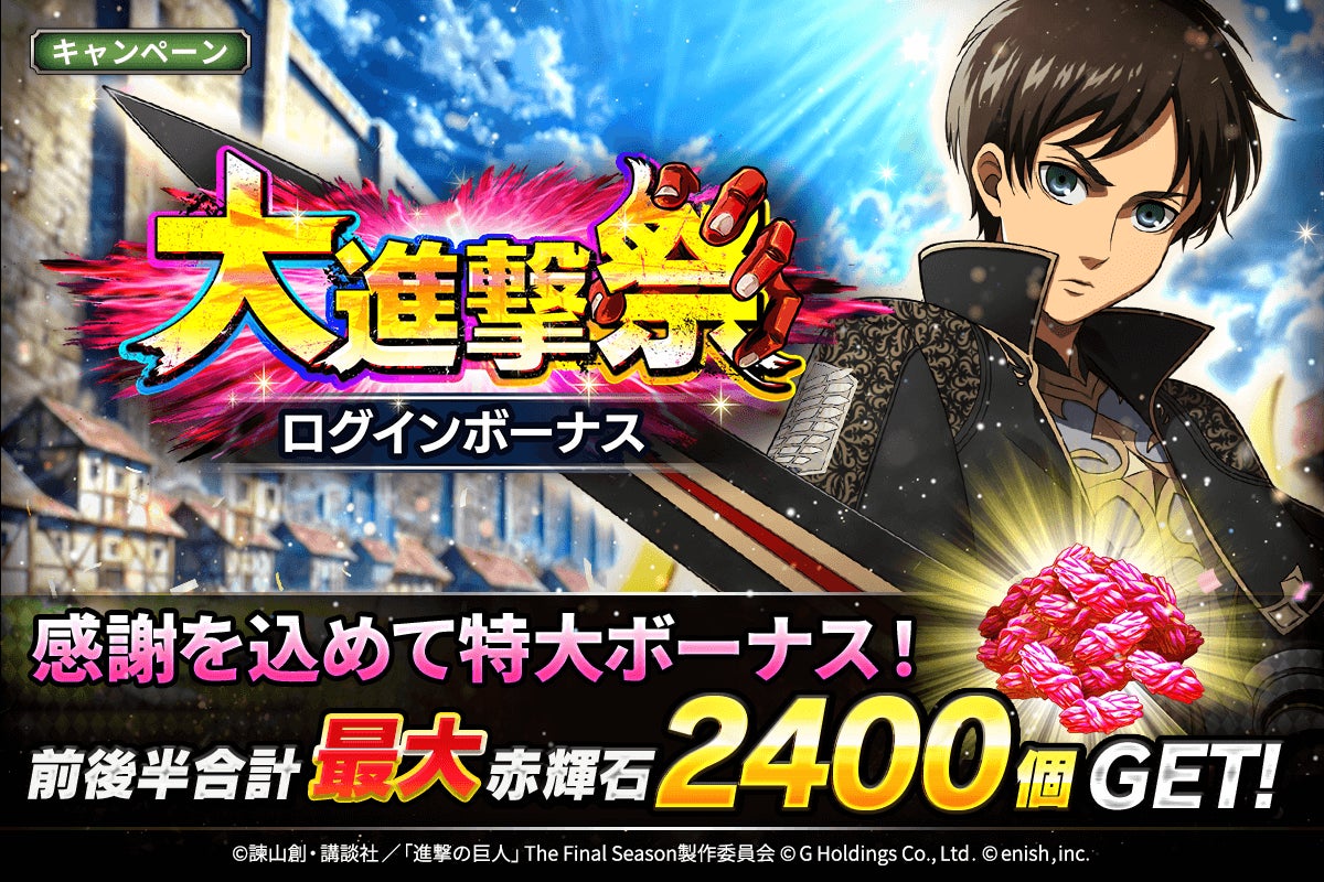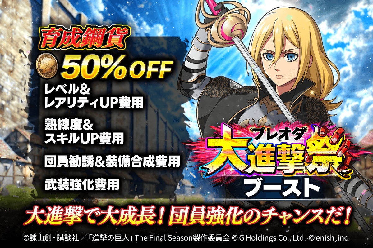 スマートフォンゲーム『進撃の巨人Brave Order』にて、新章追加、新ガチャ開催、イベント開催、ログインボーナス開催、育成ブースト開催など、盛りだくさんの内容で「進撃ブレオダ大進撃祭」が開催されます。